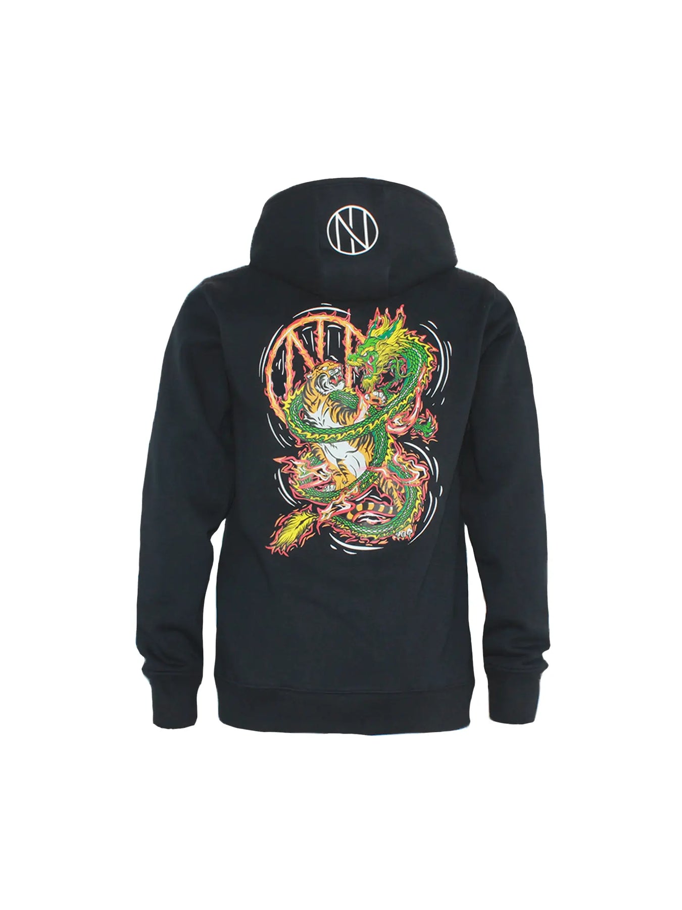 The Oni Shield Black Zip-Up Hoodie is a statement piece built for those who move with purpose. Featuring a bold, full-back graphic of a coiled dragon and fierce tiger locked in battle, this design symbolizes balance, strength, and the warrior spirit. The artwork is framed by the Oni Shield motif, representing protection against negative energy and unwavering resolve.