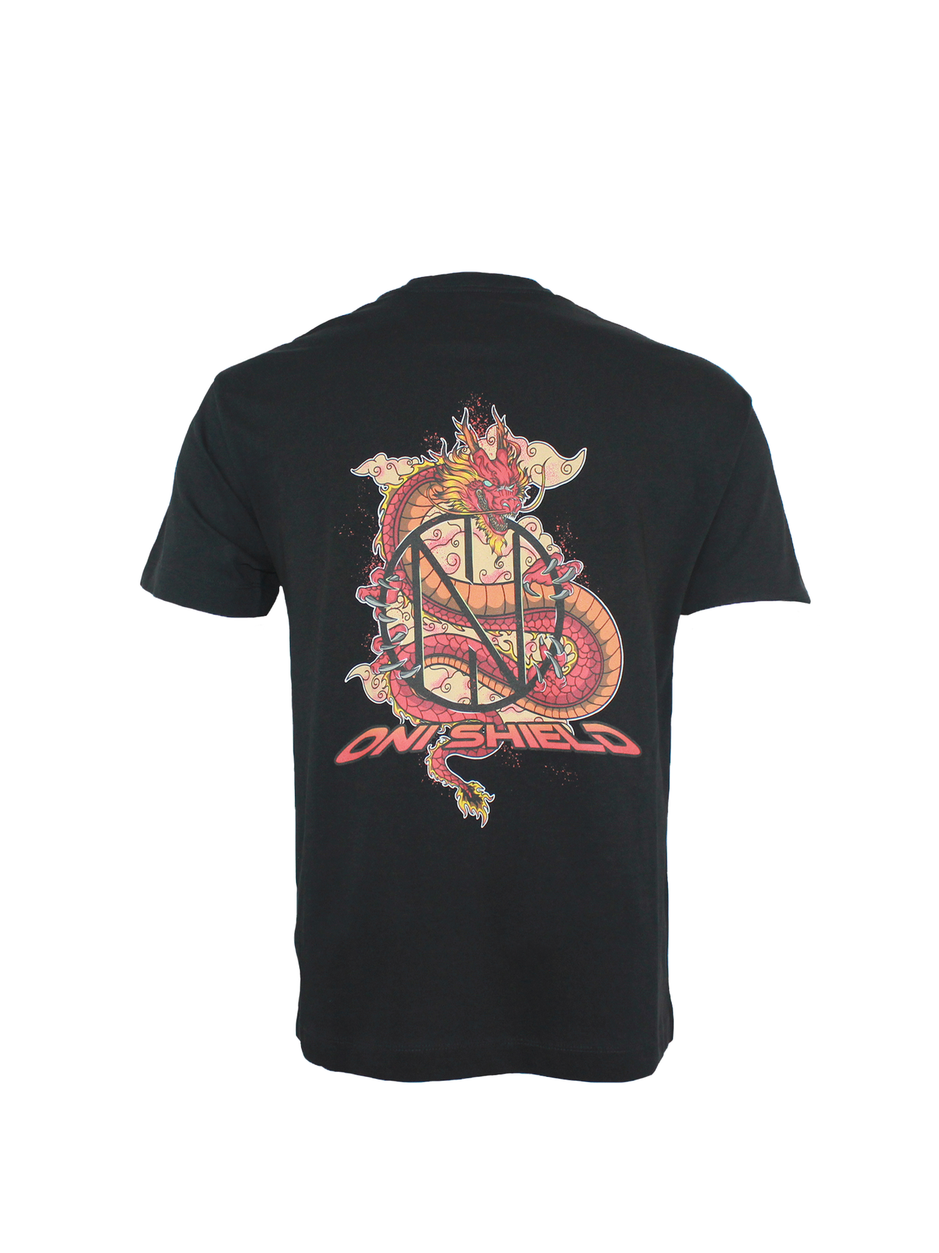 Behold the Oni shield's fire dragon, blazing across a heavy tee of pure cotton! It's soft to the touch, with a ribbed crew neck to keep things cool. The twin-needle stitching on shoulders and back neck stands up to the heat, while the hem and cuffs are also twin-needle tough. It's not just a tee, it's a fashion statement with a retail fit that says, "I'm hot stuff."