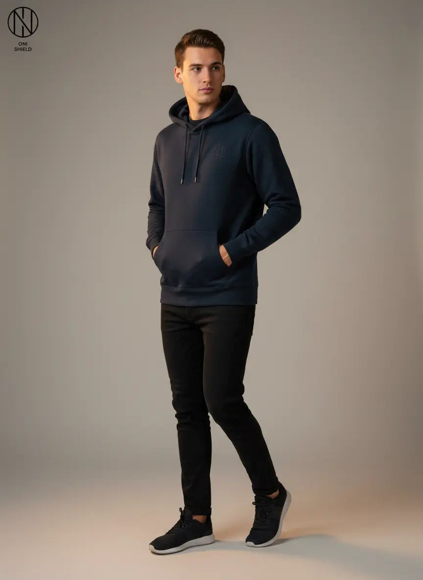 This hoodie is designed to last. The Oni shield navy hoodie undergoes a special manufacturing process to ensure it withstands daily wear and tear. So you can machine wash it without losing its shape or color. Easy care means you can enjoy your favorite hoodie without the hassle. Whether it's a chilly day or a cozy night in, this hoodie is the perfect choice for comfort and durability.