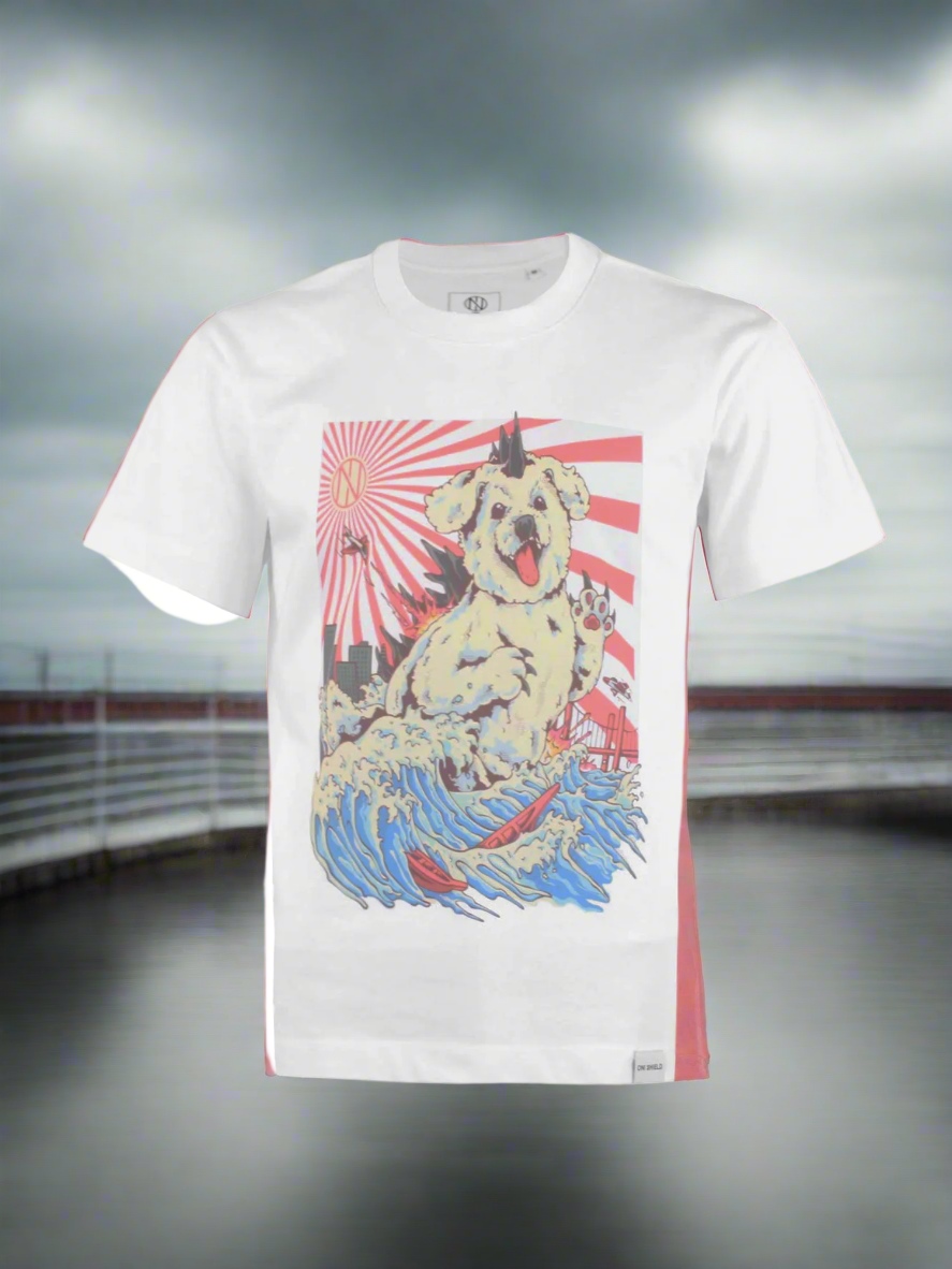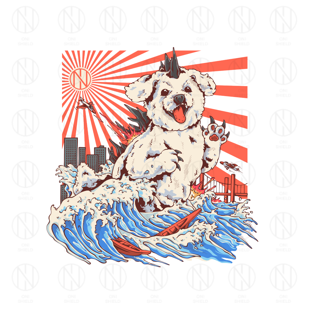 Behold the T-shirt that turns heads: a giant Bichon Frise dog monster, with an Oni shield, no less! Crafted from 100% cotton, this tee is not just a fashion statement, it's a comfort revolution. The Oni mask design sits proudly on organic cotton, while the ribbed crew neck and chain stitch detailing on the shoulders and back of the neck add a touch of the extraordinary. And let's not forget the twin-needle stitching on the hem and cuffs – because every dog-monster tee needs that extra bit of pizzazz!